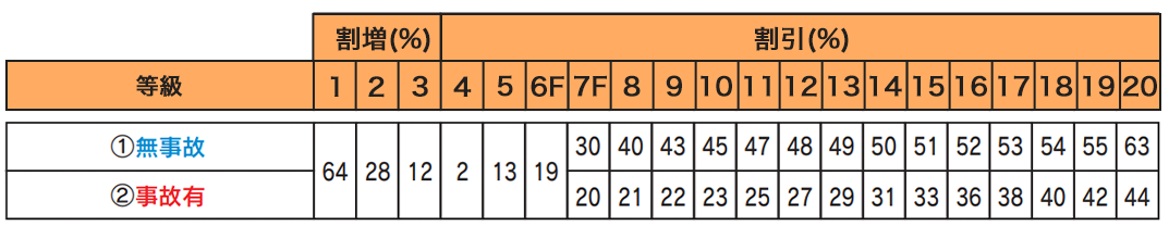 | 割増引率 | 54%割引 | 55%割引 | 63%割引 | 63%割引 | 63%割引 | |